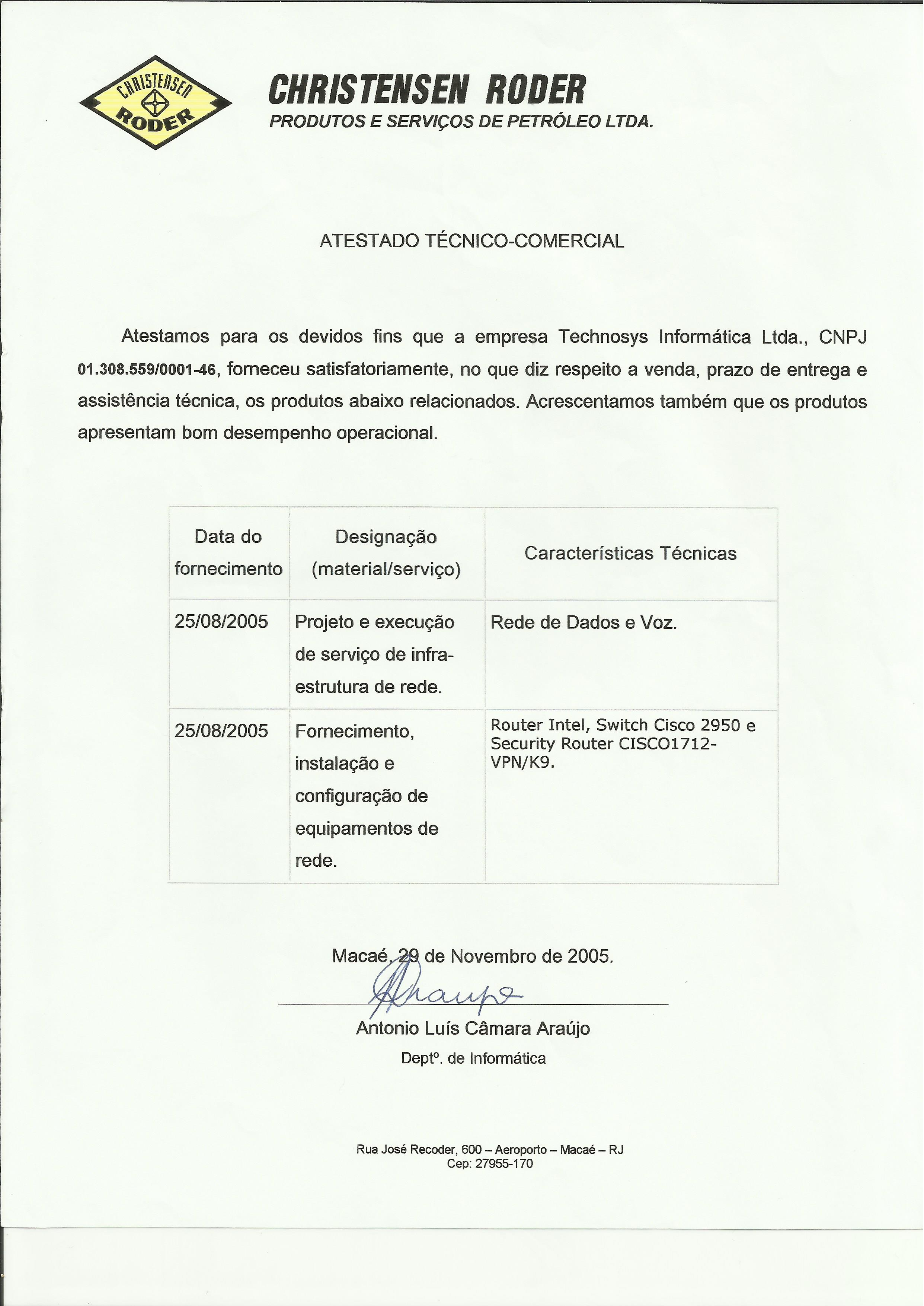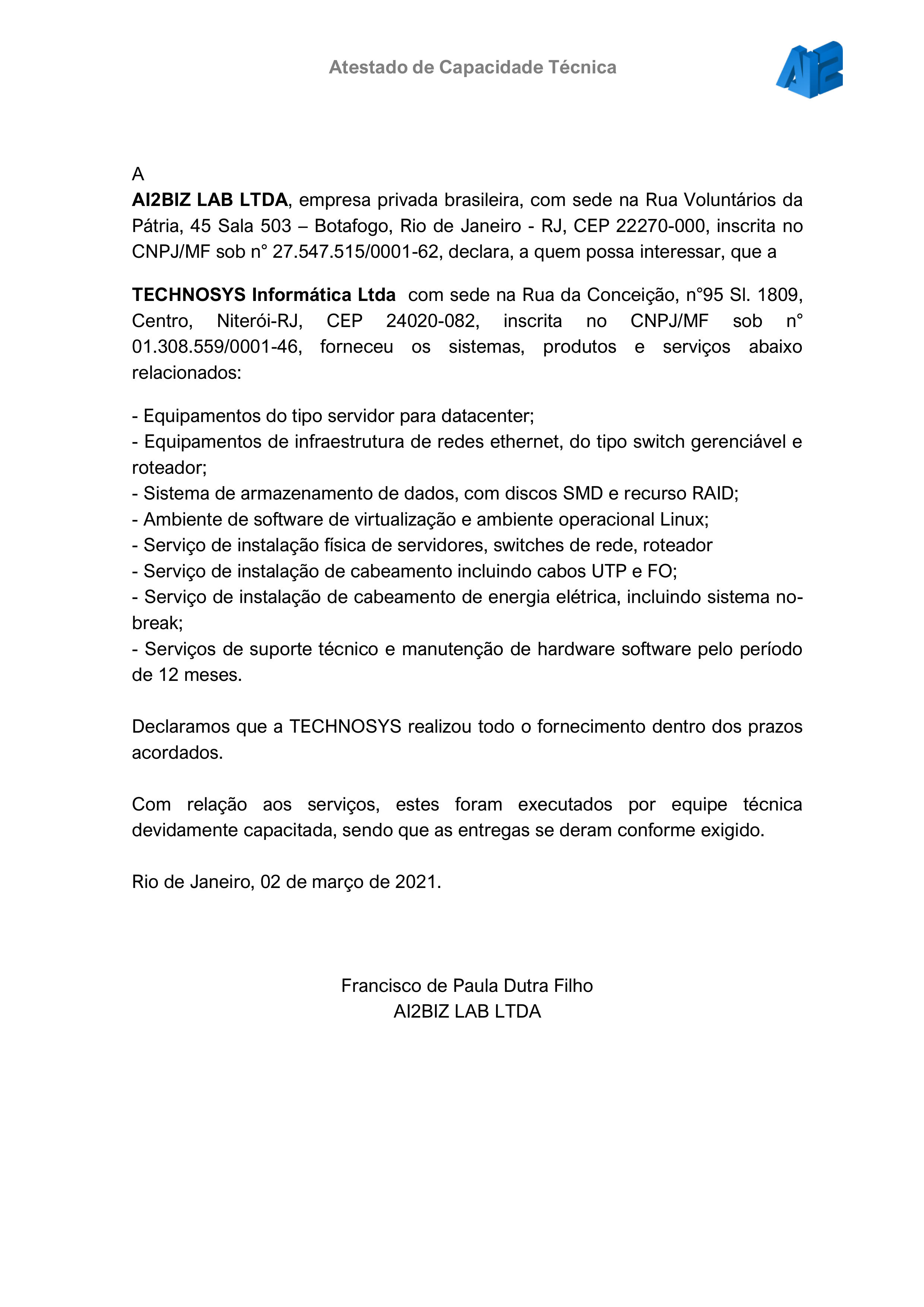 Desde 1994, a Technosys entrega soluções de TI para indústria, comércio e setores de petróleo & gás, com foco em rede estruturada, telefonia IP e suporte técnico avançado, além de solução de IA para QSMS, Aviação e Hospitalar. Abaixo, você confere os principais Atestados de Capacitação técnica que reforçam nossa expertise.